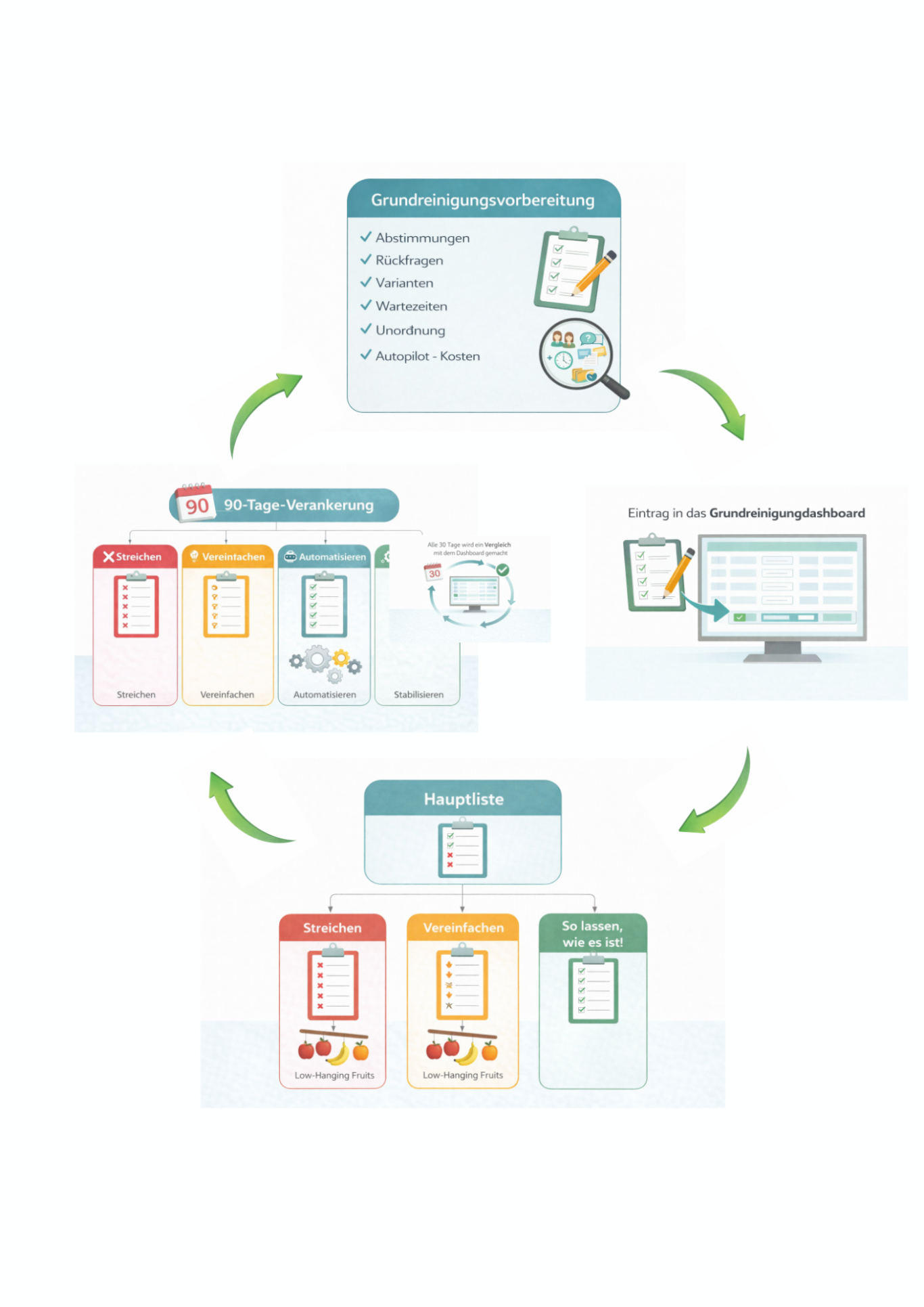 Nachdem unnötige Dinge entfernt wurden, werden die verbleibenden Abläufe klar strukturiert. Dabei geht es vor allem um: